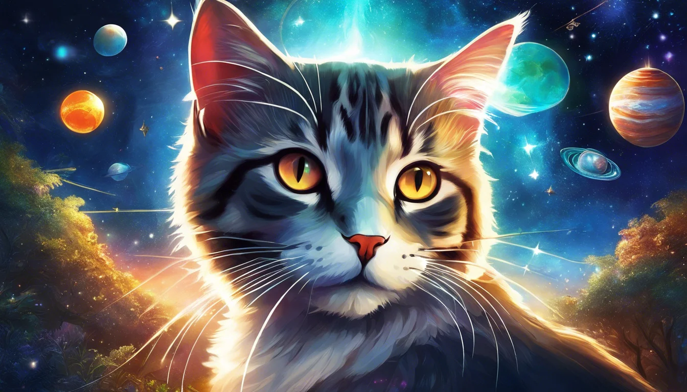 Whiskers closed his eyes, and with a gentle paw on the collar, he whispered, “Take me to the stars.” In an instant, a swirling portal of vibrant colors appeared before him, and with a graceful leap, Whiskers found himself floating in the vast expanse of space.