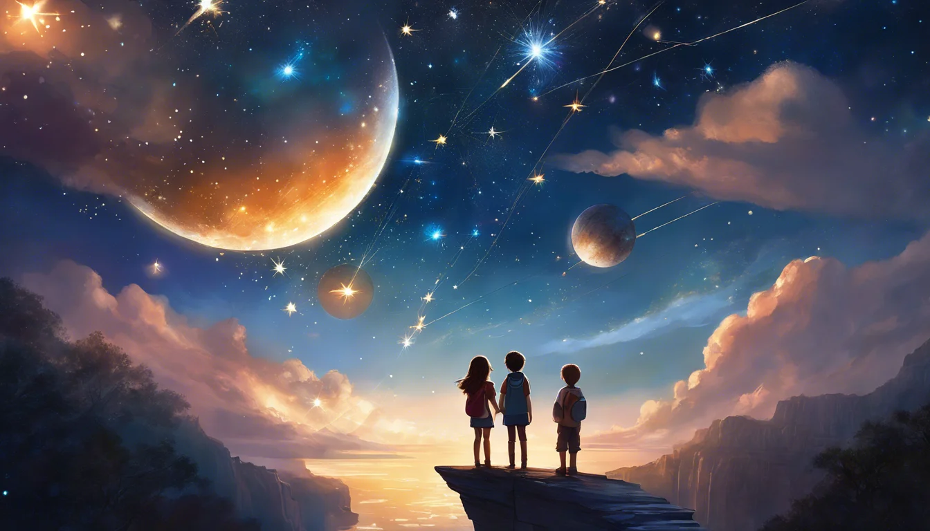 On Earth, below the watchful gaze of Luminara, there lived two children, Ellie and her younger brother, Max. Ellie was seven years old, with hair as dark as the night and eyes that twinkled like the stars above. Max, on the other hand, was five and full of boundless energy, his laughter as contagious as the twinkle of a shooting star.