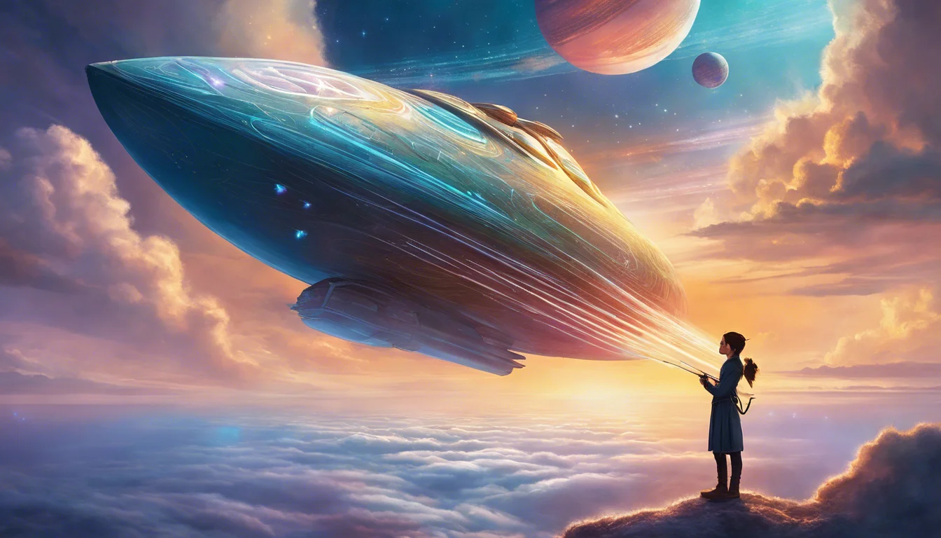Elara, filled with awe and excitement, approached the Starwhisper. The ship was crafted from the very fabric of dreams, with a hull as soft as clouds and windows that mirrored the galaxy’s beauty. It was said that only a true dreamweaver could steer the Starwhisper, for it moved not by engines or fuel, but by the power of imagination and the purest of wishes.